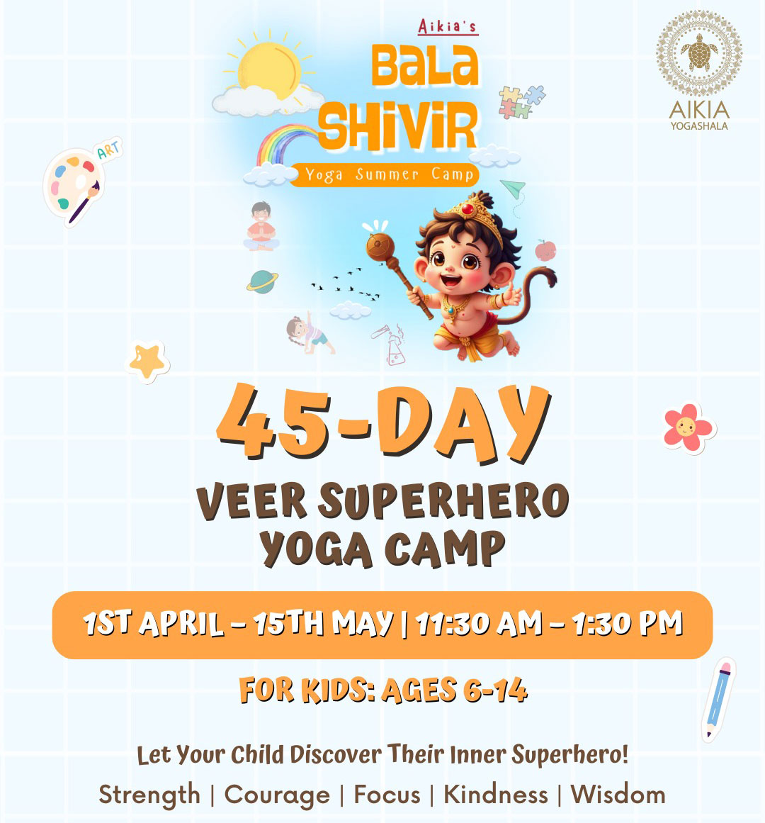 Join a 45-day adventure where kids unlock their inner superhero by embodying Hanuman’s strength, courage, focus, and kindness through yoga, storytelling, and fun challenges. Each week, they’ll explore a superpower of Hanuman, learning resilience, mindfulness, and self-confidence. Through games, breathwork, and creative activities, children develop both physical and inner strength. The journey concludes with a Superhero Graduation, celebrating their transformation.